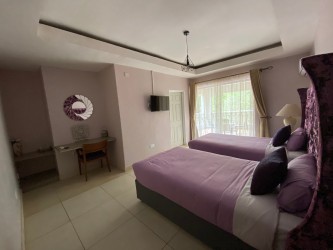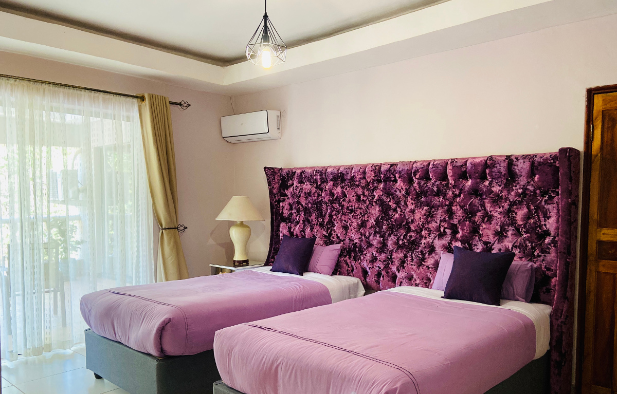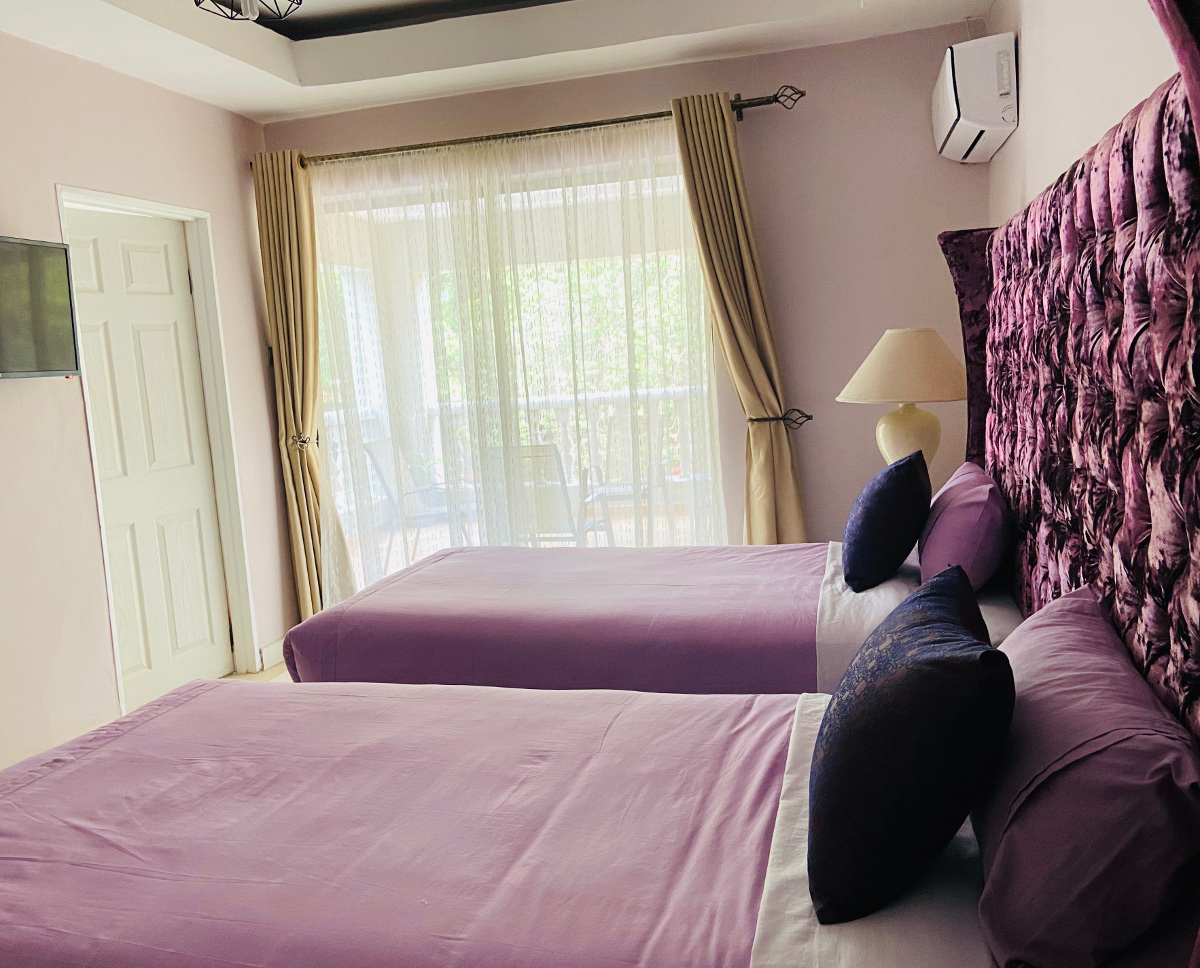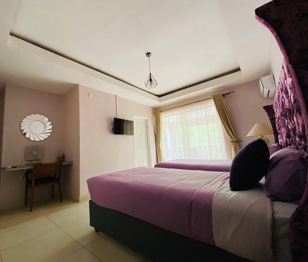 Double beds complimented by a sophisticated velvet purple and lavender bed covers are the perfect setting for a top notch get away. This is where luxury meets comfort, whether you're a resident or an international, our rooms will have you feeling right at home.